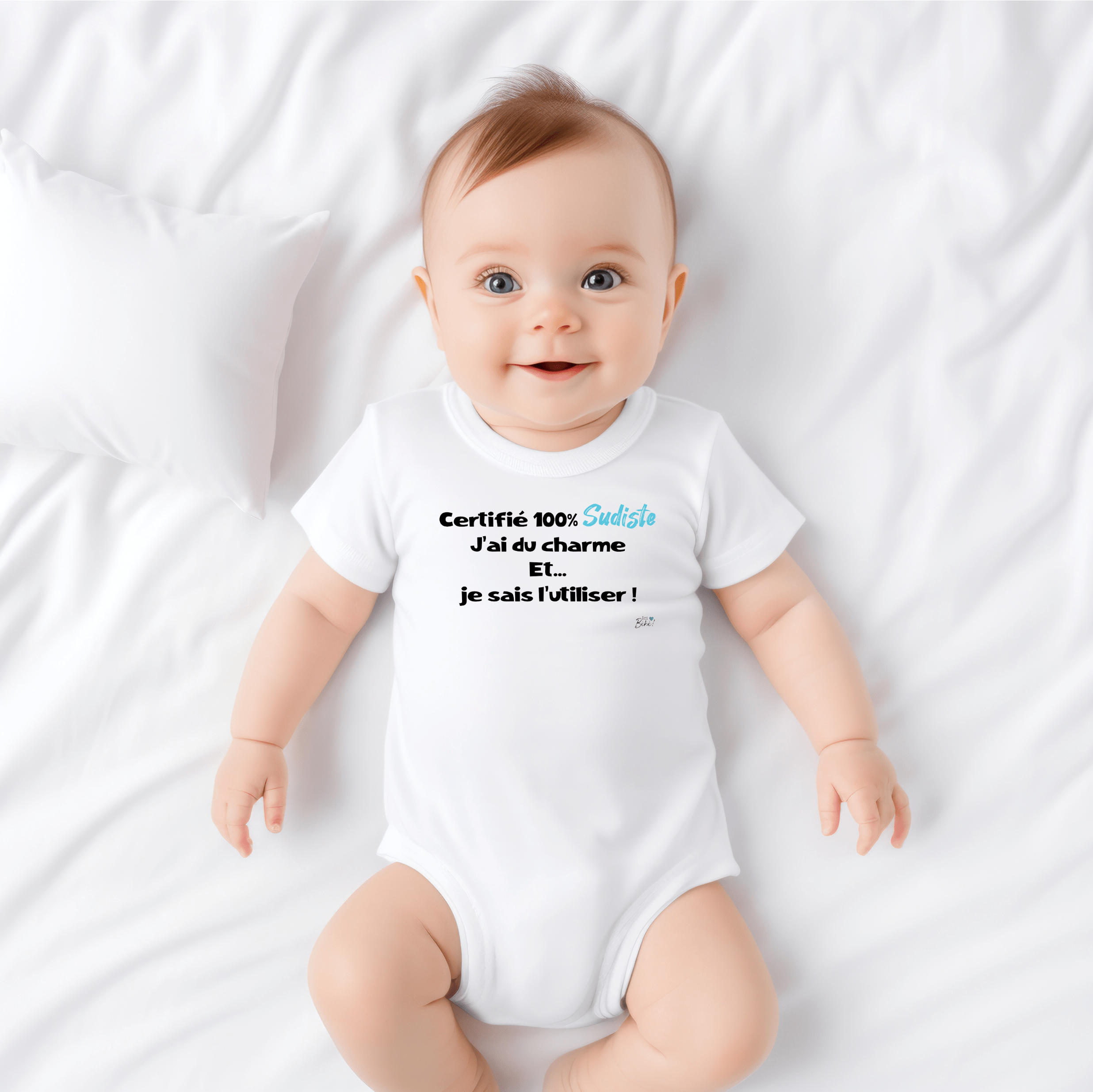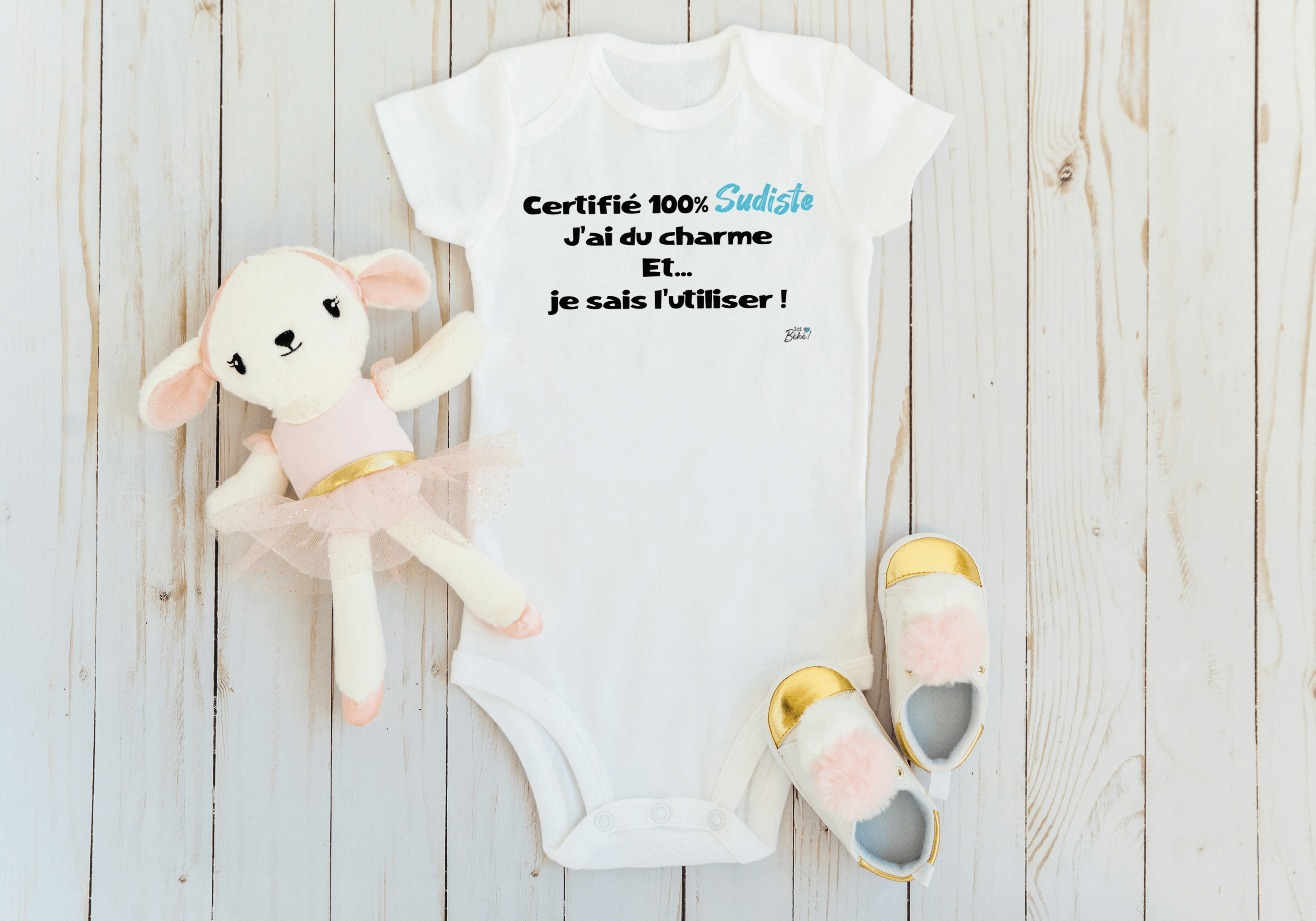 Offrez à votre bébé un look adorable et plein de style avec notre body bébé « Certifié 100% sudiste, j’ai du charme et…je sais l’utiliser ». Fabriqué en coton doux de haute qualité, ce body est non seulement confortable pour la peau délicate de votre bébé, mais il ajoute aussi une touche de charme à sa garde-robe.